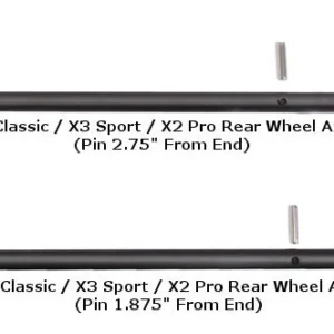 X3 Rear Axle – 19″ Long with Pin Holes at 2.75″ From End and 1.875″ From End, Complete upgraded axle assembly including collar, set screw and two axle pins. New design strengthens axle by replacing third hole with a notch that requires collar & set screw for securing to motor. The distance from end of the axle to the pin hole is critical or the wheel won’t lock onto axle.