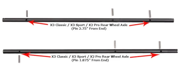 X3 Rear Axle – 19″ Long with Pin Holes at 2.75″ From End and 1.875″ From End, Complete upgraded axle assembly including collar, set screw and two axle pins. New design strengthens axle by replacing third hole with a notch that requires collar & set screw for securing to motor. The distance from end of the axle to the pin hole is critical or the wheel won’t lock onto axle.